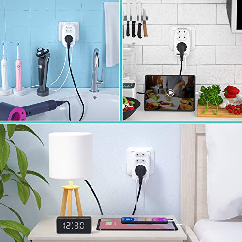 4. Helpen tegen verwarde kabels – 3-voudige meervoudige stekkerdoos multistekker – 2 x euro- en 1 x Schuko en 2 USB-aansluitingen. Met alles in een compacte eenheid bespaar je ruimte in plaats van minder apparaten te gebruiken. 3 + 2 apparaten op hetzelfde stopcontact zijn geen probleem. Ook praktisch is dat je de richting kunt veranderen, bijvoorbeeld als je de USB’s bovenaan nodig hebt, gewoon 180 graden draaien.