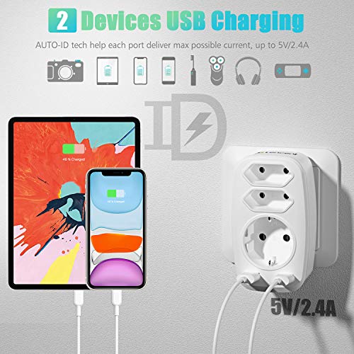 1, 5-in-1 design: 1 AC Schuko stopcontact & 2 Euro stopcontacten + 2 USB-poorten. AC Schuko geaarde stopcontact: max. Vermogen tot 4000 watt (max. 250 V, 16 A). Ingangsspanning van de USB-poorten: 100 V – 250 V AC, 50/60 Hz, 0,3 A, USB-uitgang: 5 V/2,4 A (totaal), 5 V/2,4 A (enkele aansluiting). Deze USB-poorten zijn compatibel met bijna alle USB-apparaten zoals iPhone 11, xs Max, Xs, Xr, X, 8, 7, 6 Plus en Samsung Galaxy S10, S9, S8, Plus, S7, Note 10/9/8/7, LG V20/V30/G7/G6/G5, Google Pixel 3/2 & XL enz.