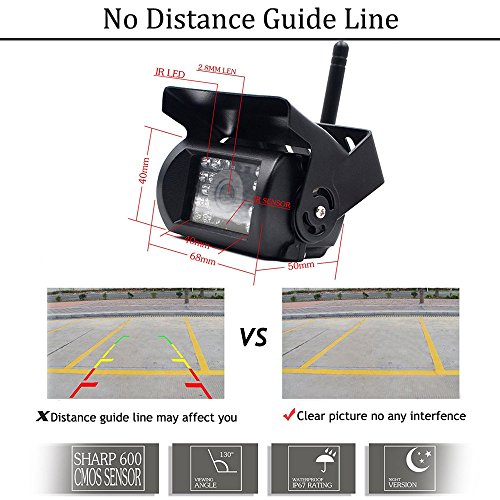 Waterdichte back-upcamera: geen afstandgeleider, je kunt het volledig werken. 18 infrarood-leds voor nachtzicht, goede prestaties overdag en ’s nachts. Schakelt automatisch naar IR als het lichtniveau laag is. 120° gezichtsveld.