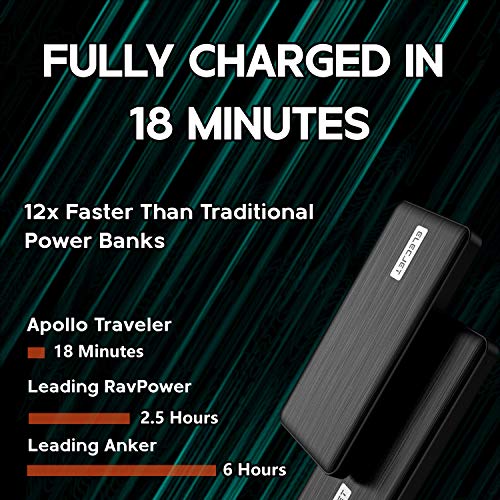 18 minuten om op te laden. – De Apollo Traveller is ’s werelds eerste en echt enige snel opladen powerbank. Hij kan binnen 18 minuten volledig worden opgeladen als je een 60 W oplader gebruikt. (Oplader in het pakket inbegrepen)